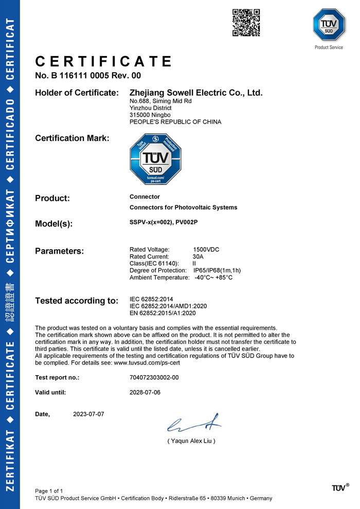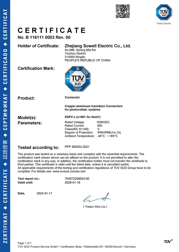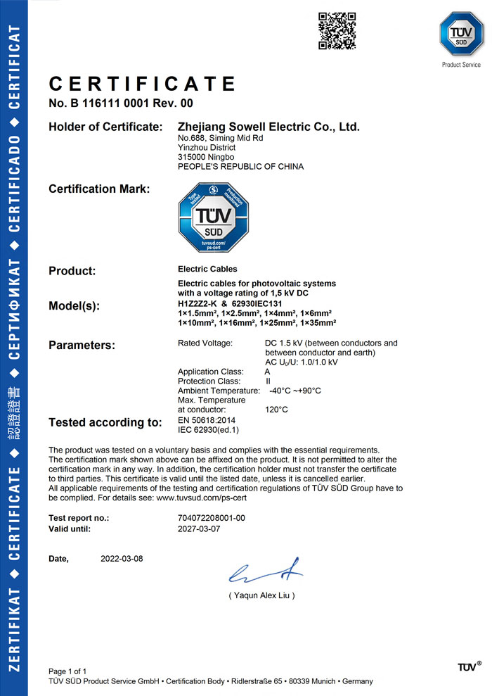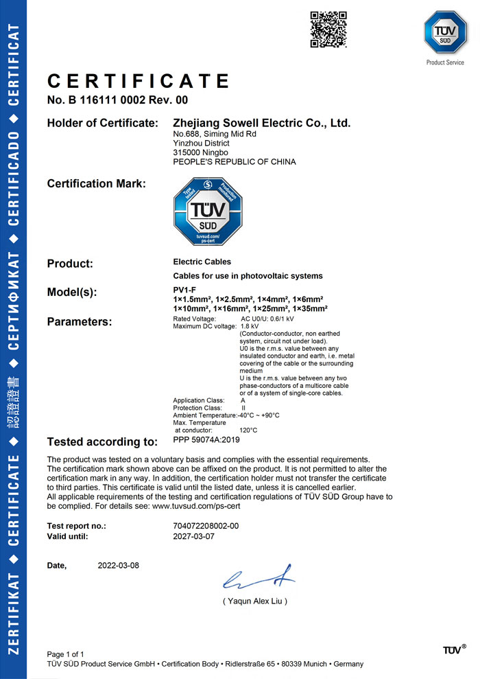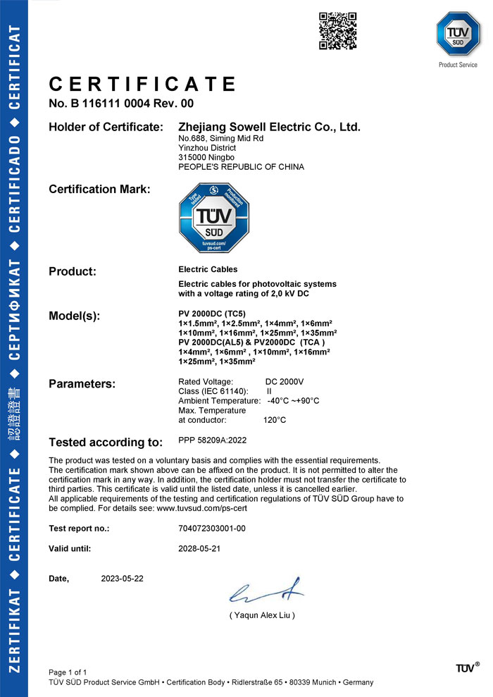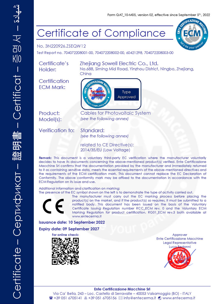 SOWELLSOLAR प्रमाणित फोटोव्होल्टेइक केबल्स आणि ॲक्सेसरीजच्या डिझाइन आणि उत्पादनावर लक्ष केंद्रित करते, यासह: